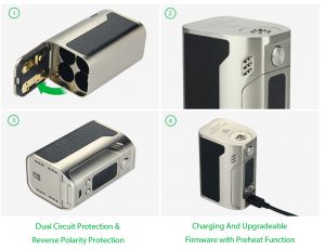 Бокс мод має дуже цікавий дизайн з можливістю кастомізації. У комплекті з пристроєм йдуть змінні накладки, за допомогою яких Ви завжди зможете оновити зовнішній вигляд бокс-мода.