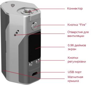 Максимальна вихідна потужність становить 200 Вт. За допомогою режиму варіватт, Ви зможете виставити потужність в будь-якому діапазоні, починаючи від 1 Вт, що дає можливість користуватися змінними і обслуговуються випарниками з будь-яким опором спіралі. Акумулятори в комплект не входять, при їх покупці зверніть увагу на те, щоб вони мали віддачею струму не менше 25 А.